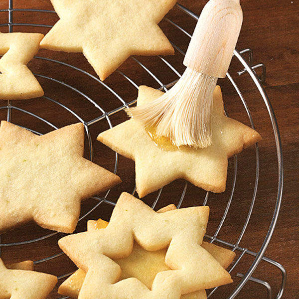 Backofen auf 180° vorheizen. Zwei Backbleche mit Backpapier belegen. Den Teig halbieren. Jede Portion zwischen Frischhaltefolie 3 mm dick ausrollen und große Sterne ausstechen. Bei der Hälfte der Sterne in der Mitte kleine Sterne ausstechen. Plätzchen ohne und mit Mittelstern aufs Blech legen. Teigreste verkneten und weitere Sterne ausstechen. Die Plätzchen im Ofen (Mitte, Umluft 160°) 10-12 Min. backen, bis sich die Ränder leicht färben.