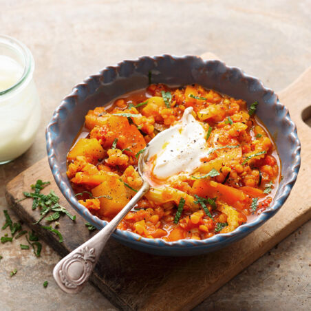 Herrlich aromatisch und obendrein noch hübsch anzusehen: Im Gegensatz zum deutschen Klassiker wird diese Variante mit roten Linsen und vegetarisch zubereitet.