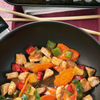 Öl im Wok erhitzen. Fleisch darin portionsweise rundherum 3 Min. frittieren. Auf Küchenpapier abfetten lassen und im Backofen bei 70° warm halten.