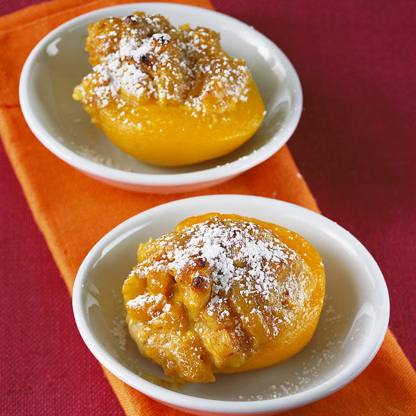 Die Pfirsiche mit der gewölbten Seite nach unten in eine Gratinform setzen, die Füllung darauf verteilen. Den Saft angießen. Pfirsiche im heißen Ofen (Mitte) ca. 15 Min. backen, bis sich eine leichte Kruste gebildet hat. Mit Puderzucker bestäubt servieren.