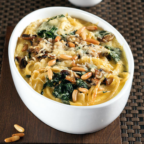 Diese Pasta hat es in sich: Aromatische Pilze, gesunder Spinat, feine Pinienkerne. Und das Ganze wird mit einer tollen Käse-Sahne-Sauce überbacken. Ein Rundum-Genuss!