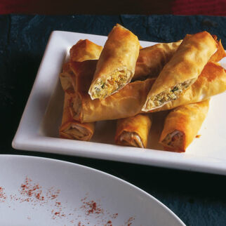 Den Backofen auf 200° vorheizen. 5 EL Butter zerlassen und die Teigblätter damit einpinseln. Die Blätter nacheinander auf ein Blech legen und im Backofen in 6-8 Min. kross und braun backen. Ofen eingeschaltet lassen.