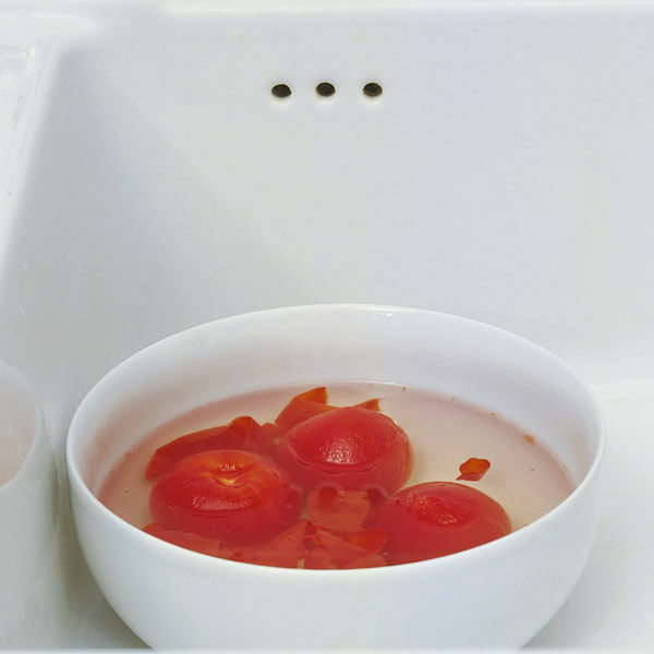 > Tomaten wie beim Ratatouille links häuten und in Stücke schneiden. Die Paprikaschoten waschen und zerteilen, dabei die Stiele und Samenwände entfernen. Das Fruchtfleisch in 3 cm große Stücke schneiden. Die Zwiebeln schälen, halbieren und in Streifen schneiden. Knoblauch schälen, in Scheiben schneiden.