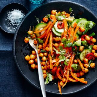 Die Karotte der Länge nach in 2-3 mm dünne Scheiben schneiden, dann mit einem kleinen Herzausstecher Miniaturherzen ausstechen. Den Saft einer Orange auspressen (für das Dressing zur Seite stellen) und die übrigen Orangen filetieren. Kichererbsen in ein Sieb abgießen, mit kaltem Wasser überbrausen und abtropfen lassen. Granatapfelkerne einer halben Frucht herauslösen und die weißen Häutchen dazwischen entfernen.