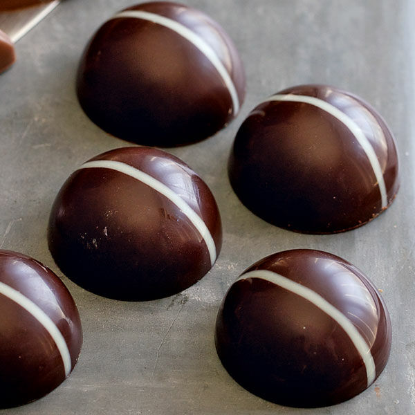 Form gründlich säubern. Weiße Kuvertüre hacken, schmelzen und temperieren. Etwas Kuvertüre in einen Papierspritzbeutel geben und jede Mulde mit einem Strich verzieren. Zartbitterkuvertüre hacken, schmelzen, temperieren. Mulden damit ausgießen, überschüssige Kuvertüre herausgießen. Ca. 2 Std. fest werden lassen.