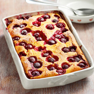 Eine Auflaufform (ca. 15 × 25 cm) mit übriger Butter einfetten und mit den Semmelbröseln ausstreuen. Die Kirschmasse in die Form einfüllen und im Ofen (Mitte) in ca. 40 Min. goldbraun backen.