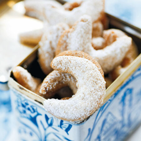Den Vanillezucker mit dem Puderzucker in einer kleinen Schüssel mischen. Die Kipferl aus dem Backofen nehmen, kurz abkühlen lassen und vorsichtig im Zucker wenden.