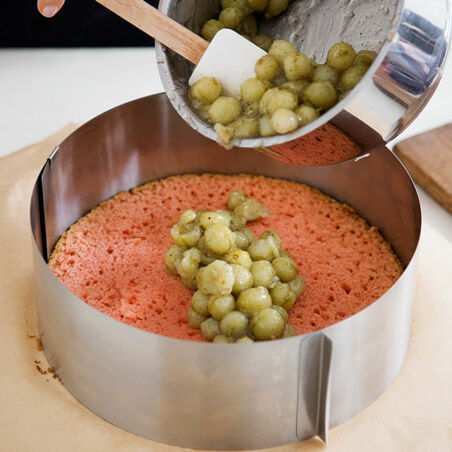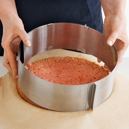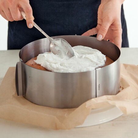 Den Kuchen im Backofen (Mitte) 30-35 Min. backen, bis an einem hineingesteckten Holzstäbchen kein Teig mehr kleben bleibt. Den Kuchen herausnehmen, auskühlen lassen und mit einem Faden oder scharfen Messer horizontal halbieren. Den unteren Boden in einen Tortenring setzen.