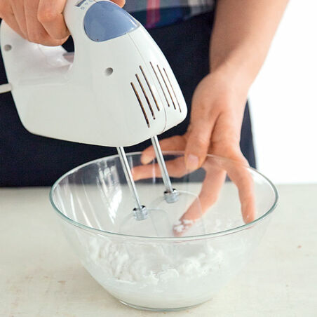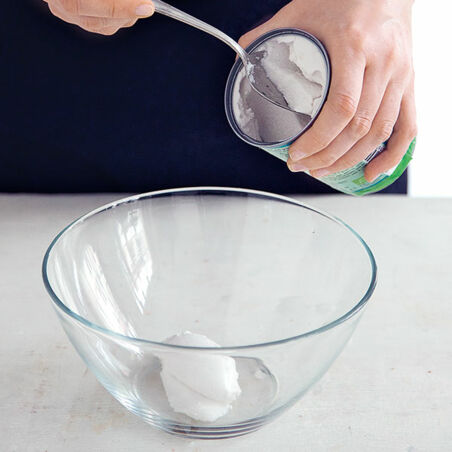 Am Backtag die Kokosmilchdose öffnen, das feste Kokosmus an der Oberfläche abheben und in einem kleinen Topf bei schwacher Hitze schmelzen lassen. Das flüssige Kokosmus erneut 2 Std. kalt stellen. (Den Rest der Kokosmilch aus der Dose anderweitig verwenden.)
