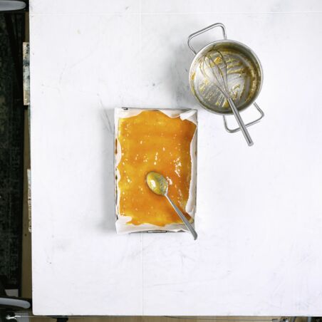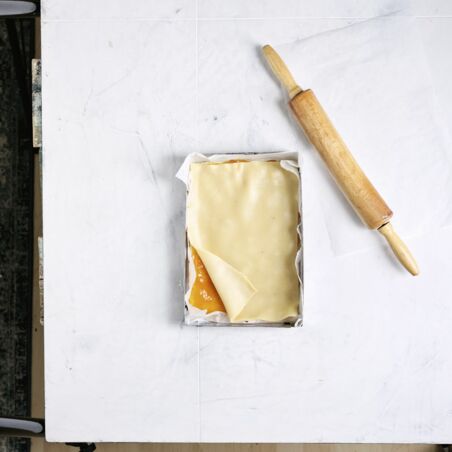 Das Marzipan zwischen zwei Bögen Backpapier zu einem Rechteck (24 × 20 cm) ausrollen. Auf die Fruchtmasse legen (Bild 4) und mindestens 2 Std. (am besten über Nacht) kühlen.