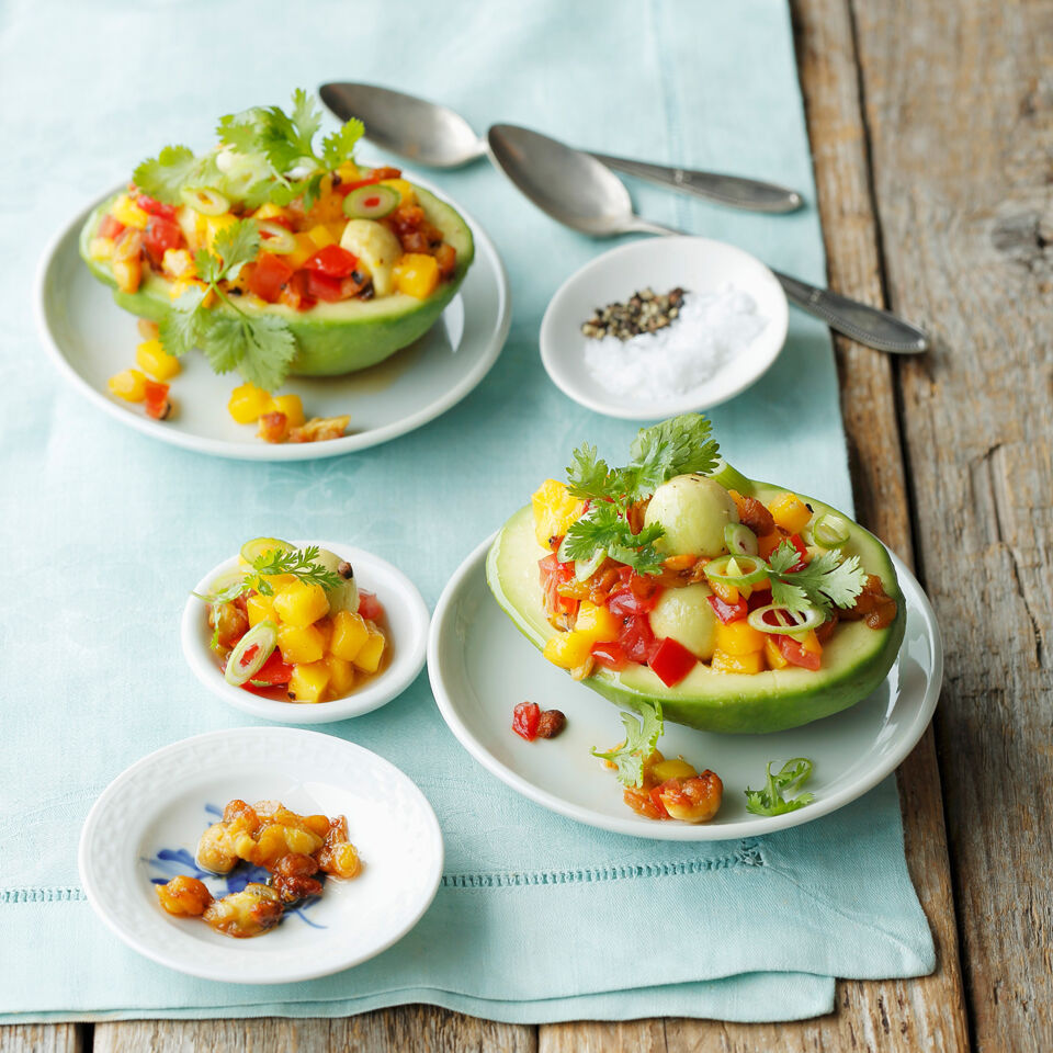 Zuerst werden die Avocados ausgehöhlt, um dann – als Schälchen – wieder mit einem Mix aus Avocado, Mango und Tempeh gefüllt werden. Da kommt nix weg.