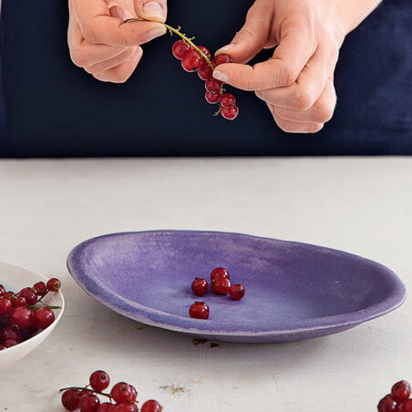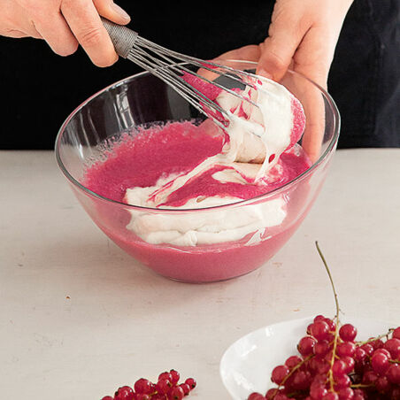 Für die Füllung die Beeren waschen, verlesen und drei schöne Rispen für die Dekoration beiseitelegen. Die restlichen Beeren vom Stiel zupfen, mit Zucker, Sojaghurt und 50 ml Wasser pürieren und das Beerenmus durch ein feines Sieb passieren.