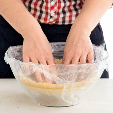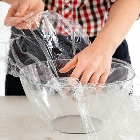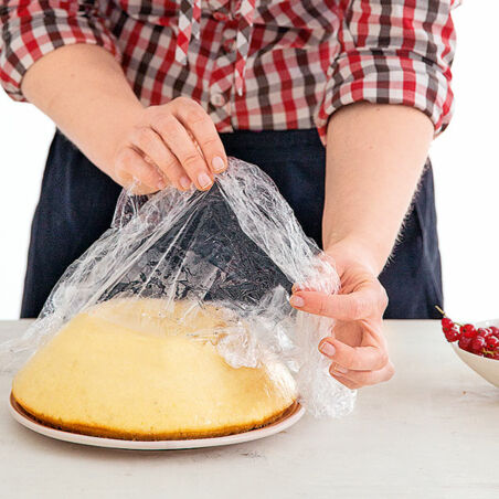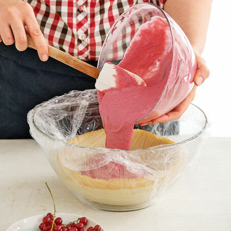 Die Schüssel mit Frischhaltefolie auskleiden. Den großen Boden noch lauwarm hineinlegen und leicht in Form drücken. Die Creme hineinfüllen, den kleinen Boden darauflegen und andrücken. Überstehende Ränder abschneiden, die Schüssel abdecken und mind. 8 Std. (oder über Nacht) in den Kühlschrank stellen.