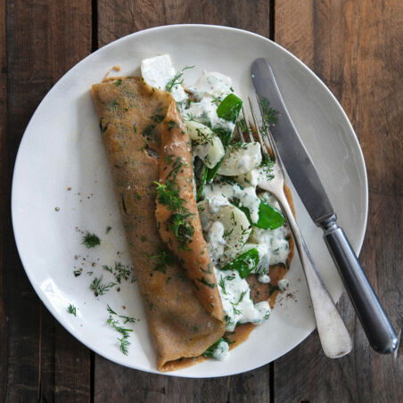 Vegane Kräuterpfannkuchen mit Mairübchen und Zuckerschoten