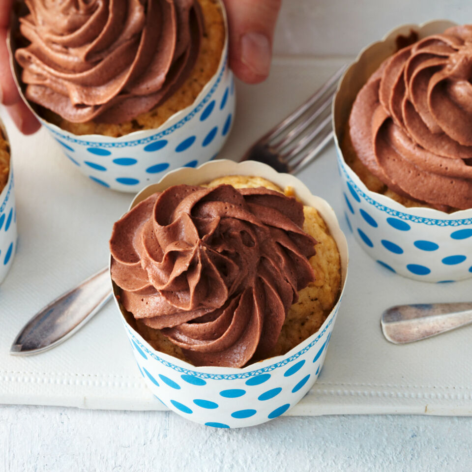Cupcakes wie im Grundrezept (siehe Rezept-Tipp) beschrieben backen. Die Sahne steif schlagen und kalt stellen. Schokolade klein hacken, in einer Schüssel über dem heißen Wasserbad schmelzen, etwas abkühlen lassen. Agavensirup nach Geschmack unterrühren. Schokolade vorsichtig unter die Sahne heben.