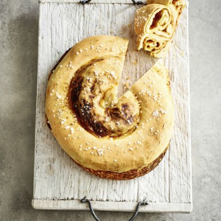 Ein Backblech mit Backpapier belegen, die Pestoschnecke darauflegen und abdecken. Weitere 30 Min. an einem warmen Ort gehen lassen. Die Pestoschnecke mit Wasser bestreichen. Im Backofen (Mitte) ca. 40 Min. backen.