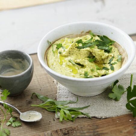 Ein besonderer Brotaufstrich. Ganz vegan. Mit Linsen, Kräutern und Sesammus.