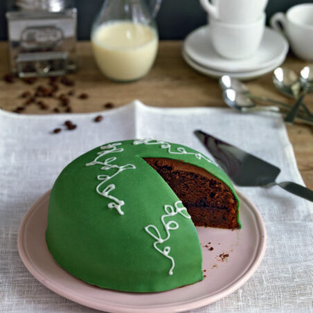 Für die Dekoration Puderzucker und Johannisbrotkernmehl mit 2-3 TL Wasser glatt rühren. Mithilfe eines Spritzbeutels mit kleiner Lochtülle florale Ranken auf die Torte spritzen, mind. 20 Min. trocknen lassen und die Torte bis zum Anschneiden kühl stehen lassen. Nach dem Anschneiden in den Kühlschrank stellen.