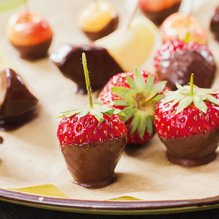 Eine feine Nascherei für zwischendurch. Wer länger etwas davon haben will, bereitet die Schokofrüchte statt mit frischen Früchten mit getrockneten zu.