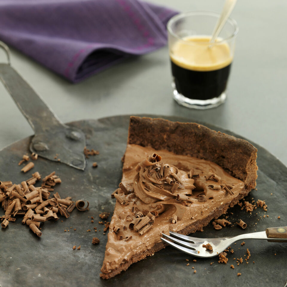 Zwei Drittel der Schokoladencreme auf dem Boden verstreichen. Die übrige Creme in einen Spritzbeutel mit Sterntülle füllen und die Tarte mit 16 Schokoladentuffs dekorieren. Von der Schokolade mit einem Sparschäler feine Löckchen abziehen und die Tarte damit bestreuen.
