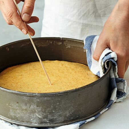 Den Teig in die Form füllen und glatt streichen. Im Backofen (Mitte) ca. 30 Min. backen. Dann die Stäbchenprobe machen! Dafür ein Holzstäbchen in die Mitte des Biskuitbodens stecken. Wenn kein Teig am Stäbchen hängen bleibt, ist er fertig. Sonst noch einige Minuten weiterbacken. Den Boden herausnehmen und abkühlen lassen.