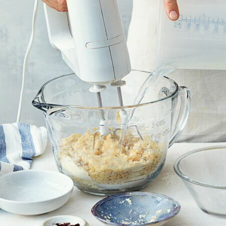 Den Backofen auf 200° vorheizen. Den Boden der Form einfetten. Für den Biskuitboden Zucker, Mehl, Sojamehl, Back- und Vanillepulver in eine Rührschüssel geben und vermischen. 200 ml kaltes Wasser und Öl dazugeben, alle Zutaten mit den Quirlen des Handrührgeräts auf höchster Stufe ca. 2 Min. aufschlagen.