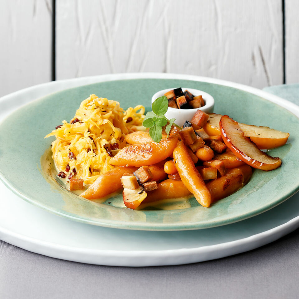 Vegane Süßkartoffel-Schupfnudeln mit orientalischem Sauerkraut