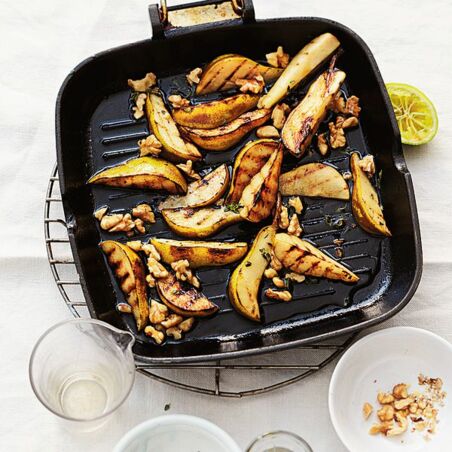 Inzwischen die Birnen waschen, halbieren, entkernen und in ca. 1 cm breite Spalten schneiden. Mit Limettensaft beträufeln. Das Öl in einer Grillpfanne erhitzen, die Birnen darin von jeder Seite ca. 1 Min. braten, bis die Birnen leicht braun sind. Ahornsirup, Thymian, Nüsse und Wein dazugeben, salzen und pfeffern. Die Flüssigkeit 3-5 Min. einkochen lassen. Die Tarte aus dem Backofen nehmen, die Birnen samt eingekochter Flüssigkeit auf der Tarte verteilen und servieren.