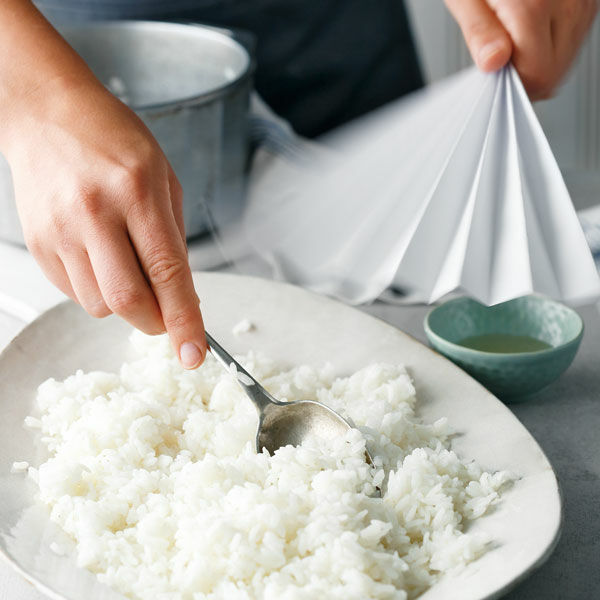 Inzwischen den Sushireis in einem Sieb so lange waschen, bis das ablaufende Wasser klar bleibt. Den Reis abtropfen lassen, dann mit 250 ml Wasser aufkochen und 2 Min. kochen. 5 Min. bei schwächster Hitze weiterköcheln und anschließend 10 Min. auf der ausgeschalteten Herdplatte ziehen lassen, dabei ein Tuch unter den Deckel klemmen.