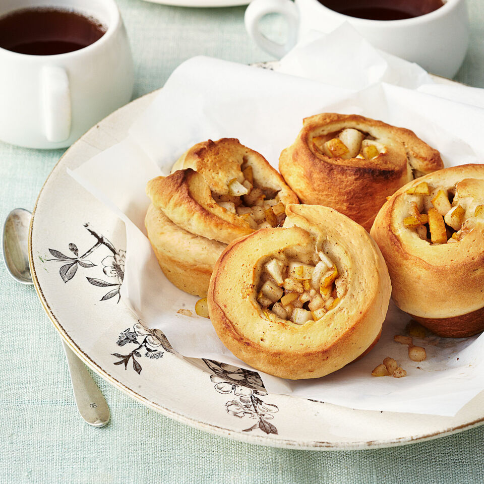 Den Hefeteig teilen und die Hälften auf einer bemehlten Arbeitsfläche jeweils zu 50 × 10 cm großen Rechtecken ausrollen. Die Birnenmischung in die Mitte der Teigrechtecke geben und die Margarine in Stückchen daraufgeben. Den Teig von der Längsseite her aufrollen. Die Teigrollen in insgesamt 12 gleich große Stücke schneiden. Die Teigstücke mit der Schnittfläche nach oben in die Mulden der Form setzen. Dabei leicht andrücken. Den Teig abgedeckt an einem warmen Ort ca. 20 Min. gehen lassen.