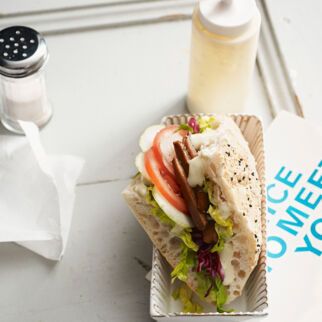 Tipp: Ein Kichererbsen-Hummus wertet den Döner auf. Dazu 230 g Kichererbsen aus dem Glas mit 50 ml eiskaltem Wasser, 2 EL Tahin, 2 EL Zitronensaft und 1 Knoblauchzehe cremig pürieren.