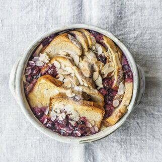 Inzwischen den Backofen auf 170° vorheizen. Die Kirschen waschen, abtropfen lassen und entsteinen. Den Joghurt mit der Speisestärke glatt rühren und unter die Quinoa heben.