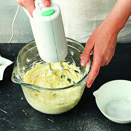 Weiche Margarine und Zucker in einer Rührschüssel mit den Quirlen des Handrührgeräts auf kleiner Stufe schaumig schlagen.