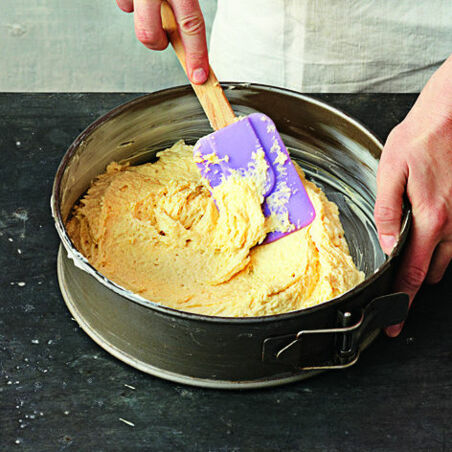 Den Teig in die Form füllen und glatt streichen. Den Teigboden im vorgeheizten Backofen (Mitte) 25 – 30 Min. backen.