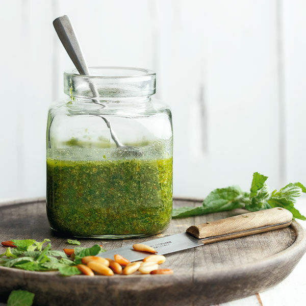 Das kräuterwürzige Pesto mit Chili und Pinienkernen schmeckt zu Nudelgerichten, aber auch als Brotaufstrich.