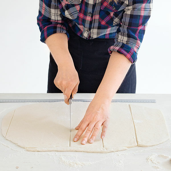 Den Teig auf der bemehlten Arbeitsfläche ca. 0,5 cm dick auf ca. 50 x 30 cm ausrollen. Die Kanten mit einem Messer begradigen und die Teigplatte in fünf Streifen von 10 x 30 cm schneiden. Den übrigen Teig nochmals ausrollen und einen Streifen von der gleichen Größe schneiden.