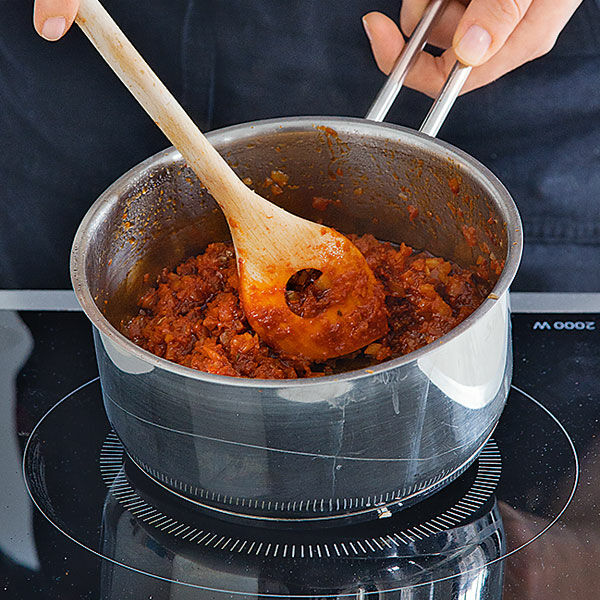 Währenddessen für die Sauce Zwiebel und Knoblauch schälen, fein würfeln und in dem Öl bei mittlerer Hitze glasig dünsten. Zucker und Tomatenmark hinzufügen und 3-4 Min. unter Rühren anschwitzen, bis das Tomatenmark bräunlich wird. Rotwein, Sojasauce, Espresso, Essig und 50 ml Wasser einrühren. Die Sauce mit Kräutern und Salz würzen und zugedeckt ca. 15 Min. bei schwächster Hitze köcheln, dabei hin und wieder umrühren.