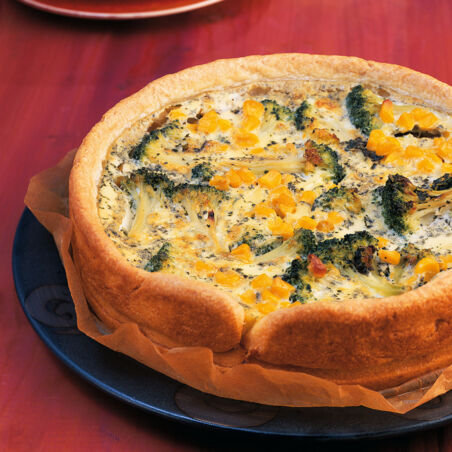 Konkurrenzalarm für den Zwiebelkuchen. Die Gemüsewähe mit Brokkoli und Mais leistet im Herbst einem Gläschen Wein gerne Gesellschaft.