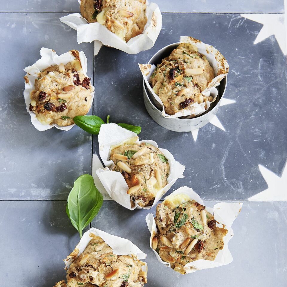 Den Backofen auf 175° vorheizen. Die Mulden der Muffinform einfetten. Möhre schälen und grob raspeln. Die getrockneten Tomaten abtropfen lassen und in kleine Stücke schneiden. Den Gouda fein reiben. Das Basilikum abbrausen und trocken schütteln, Blättchen abzupfen und fein hacken.