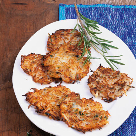 20 g Butterschmalz in eine heiße Pfanne geben. Die Raspelmischung in mehreren Häufchen in die Pfanne geben, jeweils zu einem Fladen verstreichen und bei mittlerer Hitze ca. 15 Min. braten, bis sich eine Kruste gebildet hat.