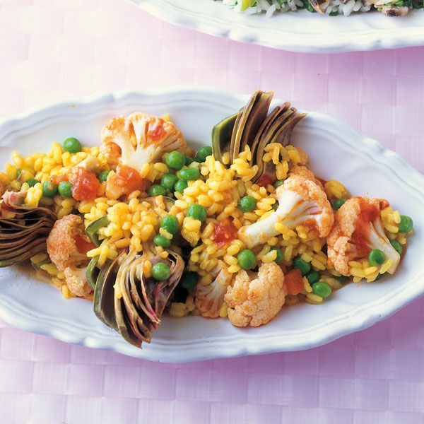Das Öl in einer paella-Pfanne oder einem großen Topf erhitzen. Knoblauch, Blumenkohl und Tomaten hineingeben und bei mittlerer Hitze 3 Min. unter Rühren anbraten. Das Paprikapulver darüber streuen und ½ Min. mitbraten. Die heiße Gemüsebrühe angießen und zum Kochen bringen. Den Reis, die Erbsen und die Artischocken hinzufügen. Den Safran und 1 kräftige Prise Salz unterrühren. Erst 10-12 Min. bei starker Hitze, dann 8-10 Min. bei schwacher Hitze garen.