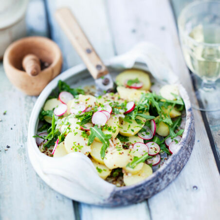 Radieschen und Rucola in einer Schüssel mit dem Öl mischen und mit dem Schnittlauch unter die Kartoffeln heben. Den Salat mit Salz, Pfeffer und nach Belieben etwas Essig abschmecken.
