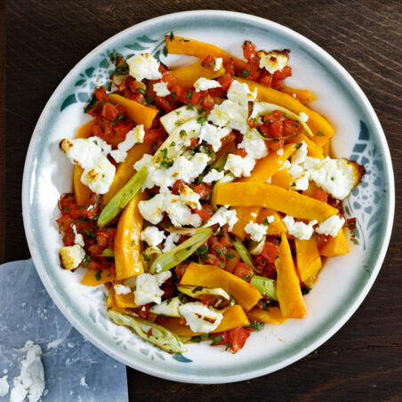 Den Kürbis in eine feuerfeste Form verteilen. Tomaten darübergeben und mit dem Käse belegen oder bestreuen. Den Kürbis im Ofen (Mitte, Umluft 180°) 15-20 Min. backen, bis der Käse leicht gebräunt ist. Das Gratin schmeckt heiß, lauwarm und auch abgekühlt gut. Fein zu Lammkoteletts oder gebratenen Fischfilets.