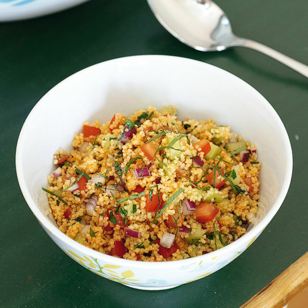 Die Gurke schälen, längs halbieren, entkernen und fein würfeln. Die Tomaten waschen, halbieren und ohne Kerne und Stielansätze ganz fein würfeln. Die Zwiebel schälen und fein würfeln. Kräuter waschen, trocken schütteln und tupfen, die Blätter abzupfen und fein hacken. Vorbereitete Zutaten mit dem Couscous mischen.