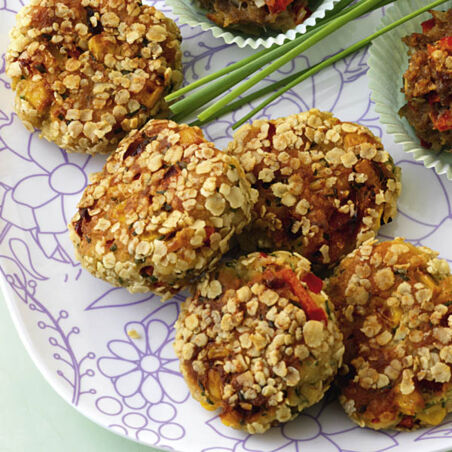 Den Schnittlauch waschen, trocken schütteln und in Röllchen schneiden. Die Paprika waschen, putzen und klein würfeln. Quark, Gemüse und Schnittlauch unter die Brotmasse kneten. Ist sie zu weich, Haferflocken dazugeben, bis der Teig nicht mehr klebt. Aus der Masse mit den Händen Taler formen und rundherum in Haferflocken wälzen.