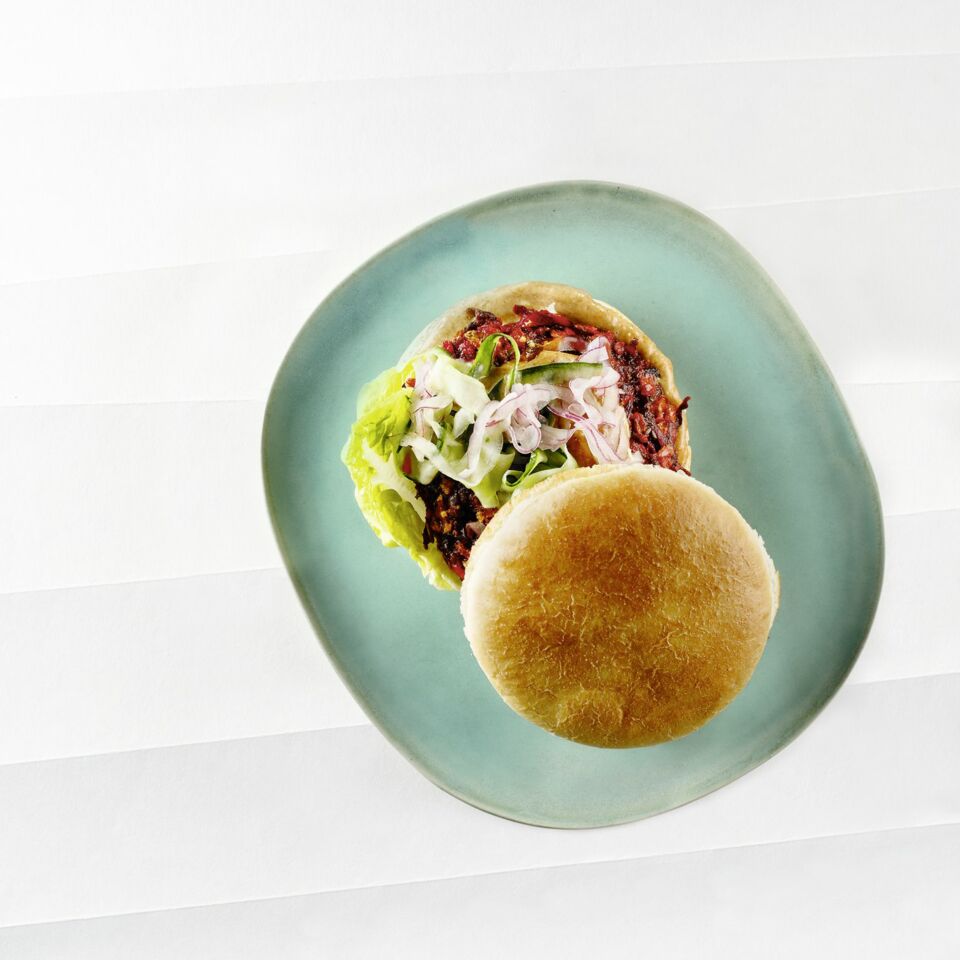 Saftige Patty aus Rote-Bete bilden das Herzstück dieser vegetarischen Burger. Eine fruchtige Nusscreme ergänzt diese perfekt.