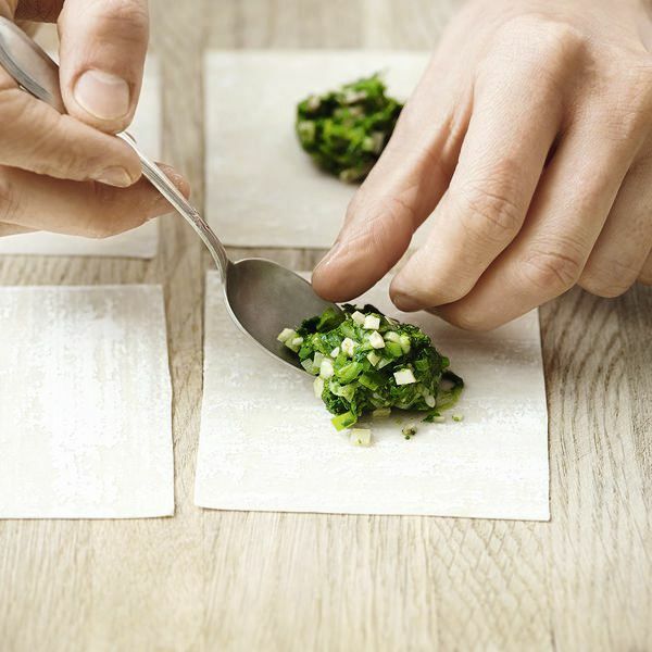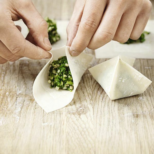 4 Teigblätter vom Stapel abziehen und nebeneinander auf die Arbeitsfläche legen, die übrigen wieder mit dem feuchten Tuch bedecken. Auf die Mitte der Teigblätter je 1 gehäuften TL Spinat-Pilz-Masse geben. Die Ränder mit etwas Wasser anfeuchten. Die Teigecken jeweils über der Füllung zusammennehmen. Die »Nähte« zusammendrücken und verschließen. Auf diese Weise insgesamt 12 Veggie-Wan-Tan herstellen. Nicht benötigte Teigblätter wieder einfrieren.