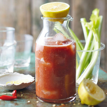 Übriges Selleriesalz, Chilischote, gehackten Sellerie und Zitronensaft mit Tomatensaft und -ketchup in einen Standmixer geben, pürieren.