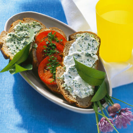 Die Brote mit Bärlauchbutter bestreichen. Ein Drittel mit Quark bestreichen, ein Drittel mit Tomaten belegen, den Rest nach Belieben nur mit Butter belassen. Die Tomatenbrote salzen, pfeffern und mit den restlichen geschnittenen Kräutern bestreuen. Die Brote teilen und mit den zurückgelegten Bärlauchblättern anrichten.