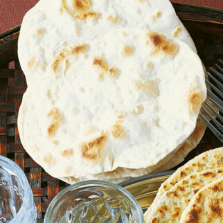 Die Fladen einzeln in einer heißen Pfanne ohne Fett pro Seite knapp 1 Min. backen. Dann abermals wenden, mit dem Pfannenwender auf den Fladen drücken, sodass er sich nicht aufbläht, und weitere 30-60 Sek. backen. Die Fladen jeweils herausnehmen, sofort von beiden Seiten dünn mit Ghee bestreichen und bis zum Servieren zwischen einem sauberen Geschirrtuch warm halten.